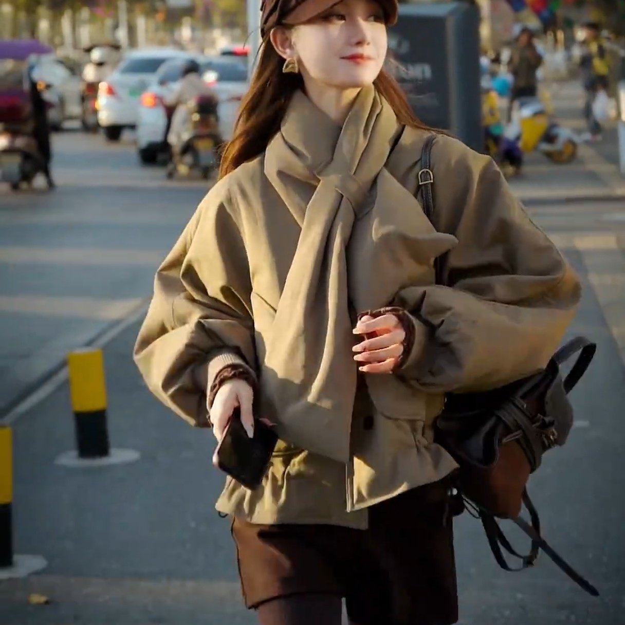 欧货围巾领短款羽绒服女2025冬季新款宽松显瘦加厚保暖白鸭绒外套
