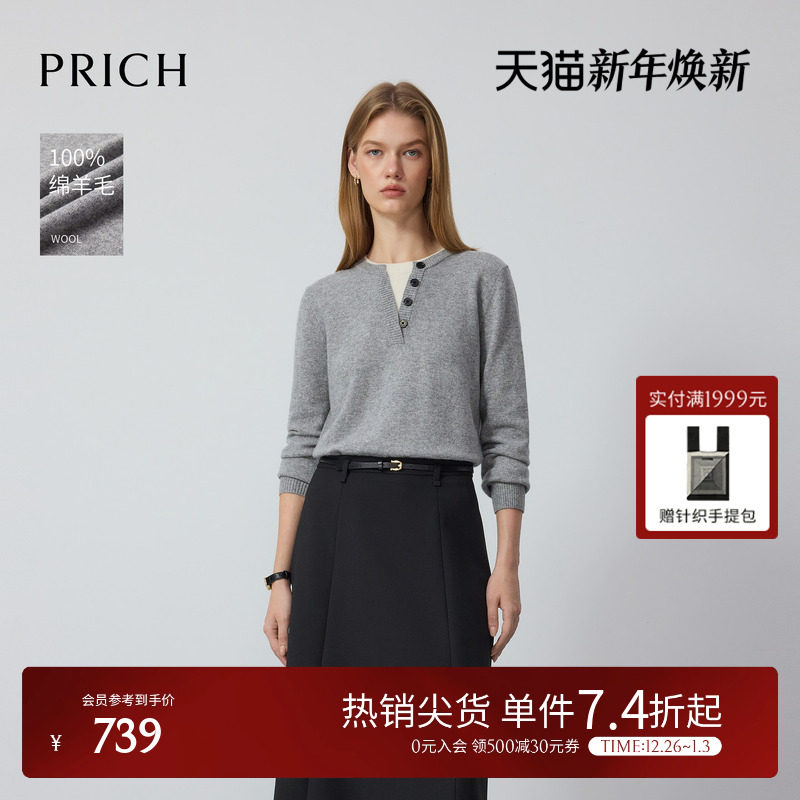 【绵羊毛】PRICH时尚格雷系假两件针织衫2025冬季新款气质毛衣女