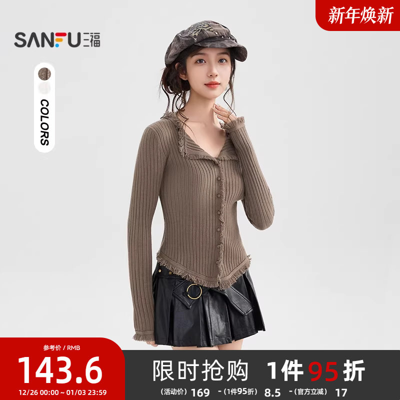 三福开衫毛衣2025新款冬季气质毛须边翻领修身织衫上衣女装513798