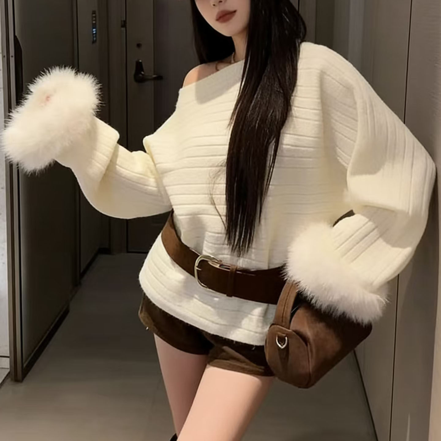 法式温柔风毛毛袖气质毛衣女露肩蝙蝠袖宽松显瘦百搭针织衫上衣潮