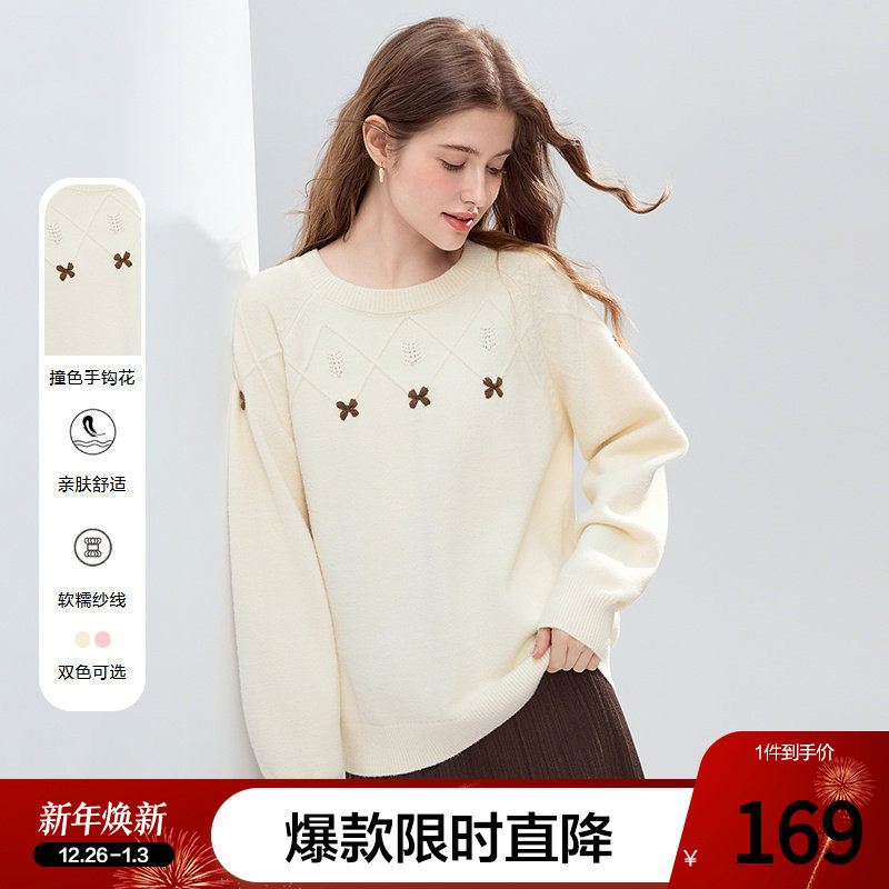 betu百图气质蝴蝶结提花圆领毛衣女2025年冬季新款慵懒风针织衫