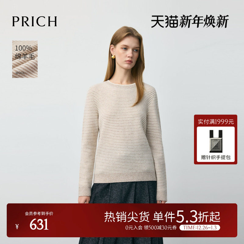 【100%绵羊毛】PRICH简约撞色条纹针织衫2025冬季新款气质毛衣女