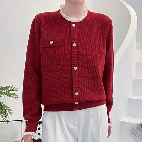 阔色荷叶边红色气质毛衣女装2025秋冬季新款软糯宽松针织衫上衣