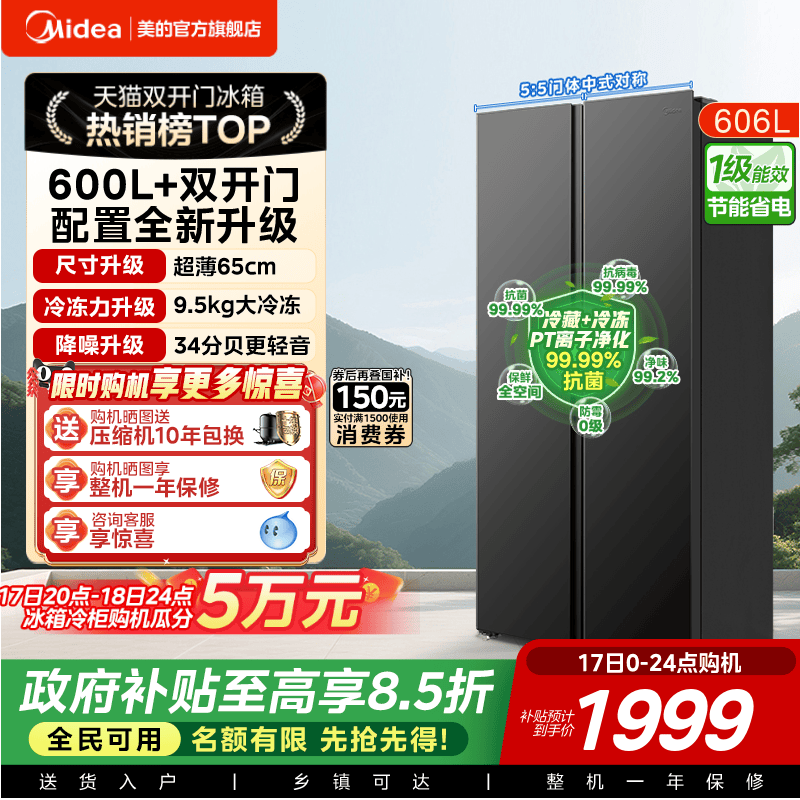 美的550L对开双开门大容量风冷无霜一级能效家用电冰箱官方旗舰店