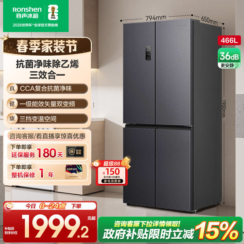 容声466L十字对开双开四门大容量家用一级电冰箱风冷超薄换新补贴