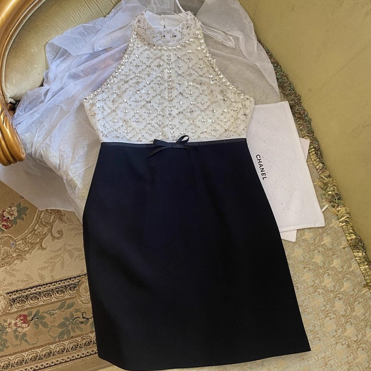 2025秋冬新款重工镶钻无袖连衣裙 miu风修身性感无袖中裙蝴蝶结裙