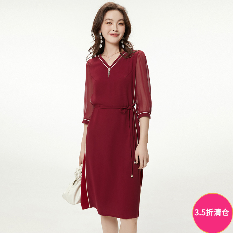 粉红玛琍连衣裙女夏季新款V领桑蚕丝时尚减龄收腰中裙PMANS5063