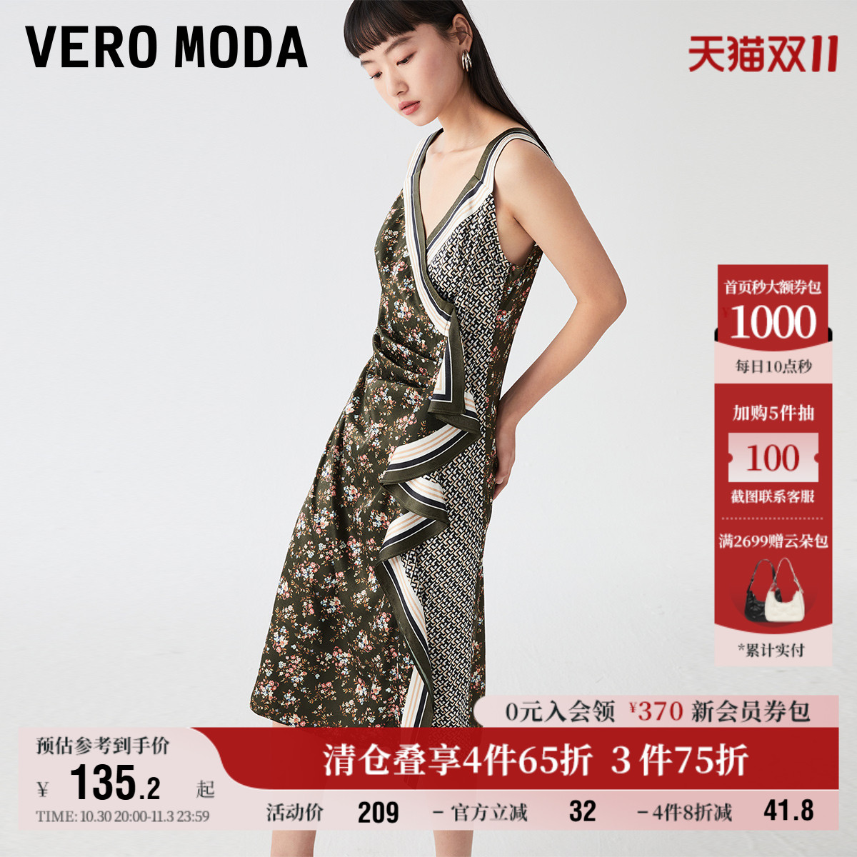 Vero Moda奥莱连衣裙夏季清仓V领无袖不规则设计印花中裙气质女人