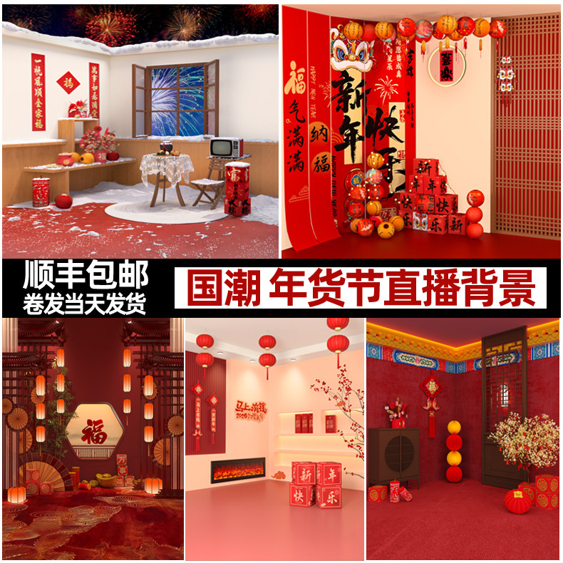 2025年新3D立体新春节年货国潮风影楼拍照喜庆直播间背景墙背景布