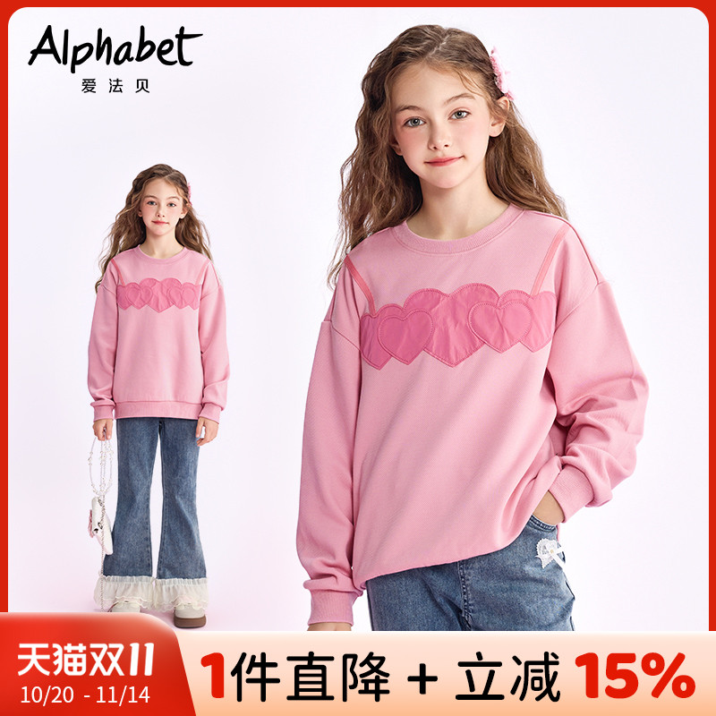 爱法贝25春秋新款女童卫衣宽松长款中大儿童装学生甜美爱心套头衫