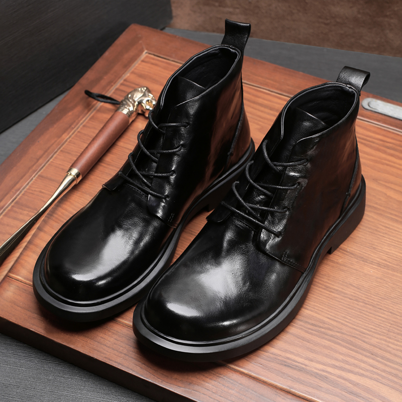 秋冬头层牛皮男士高帮皮鞋厚底中帮商务大头皮靴圆头马丁靴男真皮