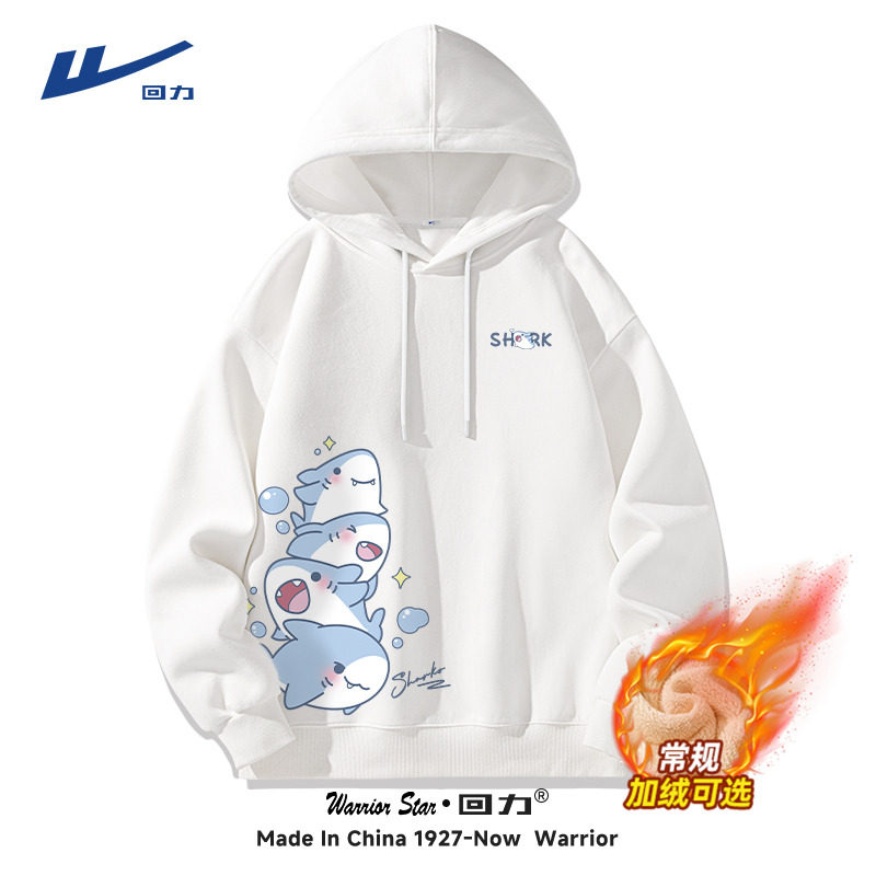 回力卫衣男秋季青少年鲨鱼男款上衣2025新款男生白色加绒连帽衣服