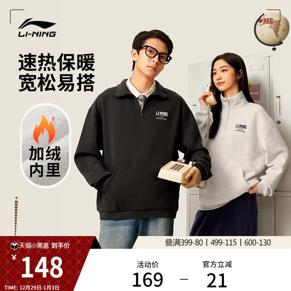 李宁加绒半拉链卫衣女冬季官方新款情侣无帽上衣美式宽松运动服男