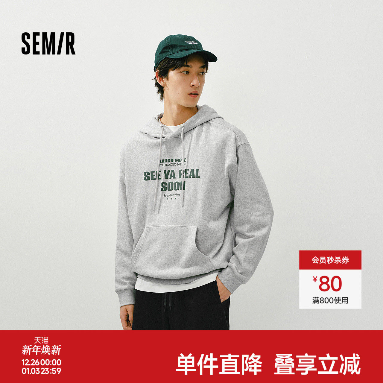 森马卫衣男春季时尚字母印花上衣情侣宽松抽绳连帽服简约百搭通勤