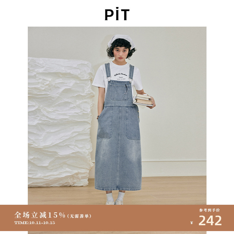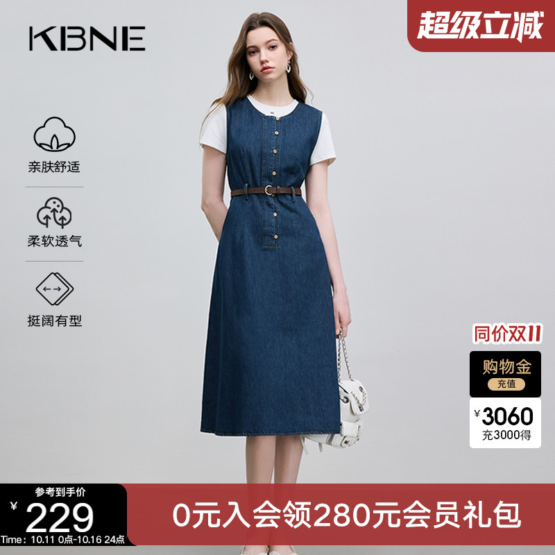 KBNE牛仔背带裙女复古裙子气质新款学院风深蓝色竖排扣a字连衣裙