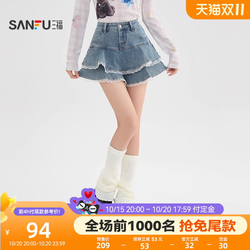 三福牛仔短裙2025新款秋季蕾丝花边蛋糕裙a字半身裙子女装508227