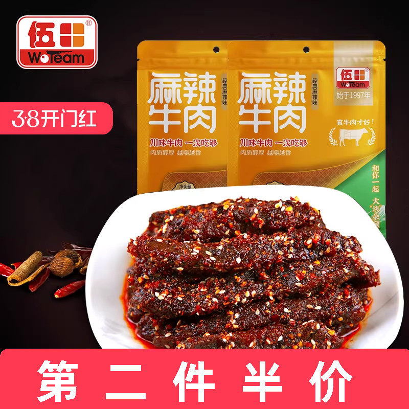 伍田四川麻辣牛肉辣条零食小包装成都冷吃牛肉香辣牛肉条98g*2袋