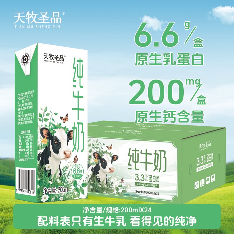 天牧圣品3.3g蛋白纯牛奶营养早餐儿童纯牛奶200mlX24盒