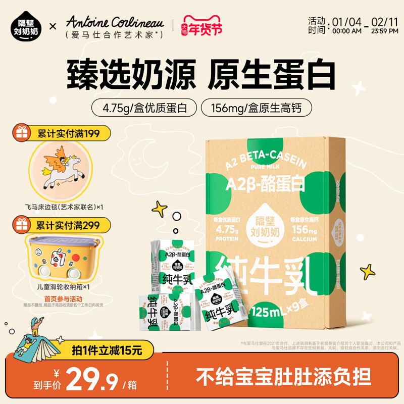 【秒杀】隔壁刘奶奶A2β-酪蛋白mini儿童纯牛奶125ml*9盒高钙奶