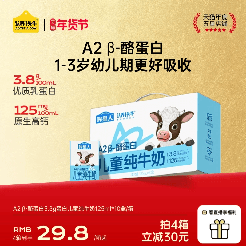 认养一头牛哞星人A2β酪蛋白儿童纯牛奶125ml*10盒宝宝奶新年礼盒