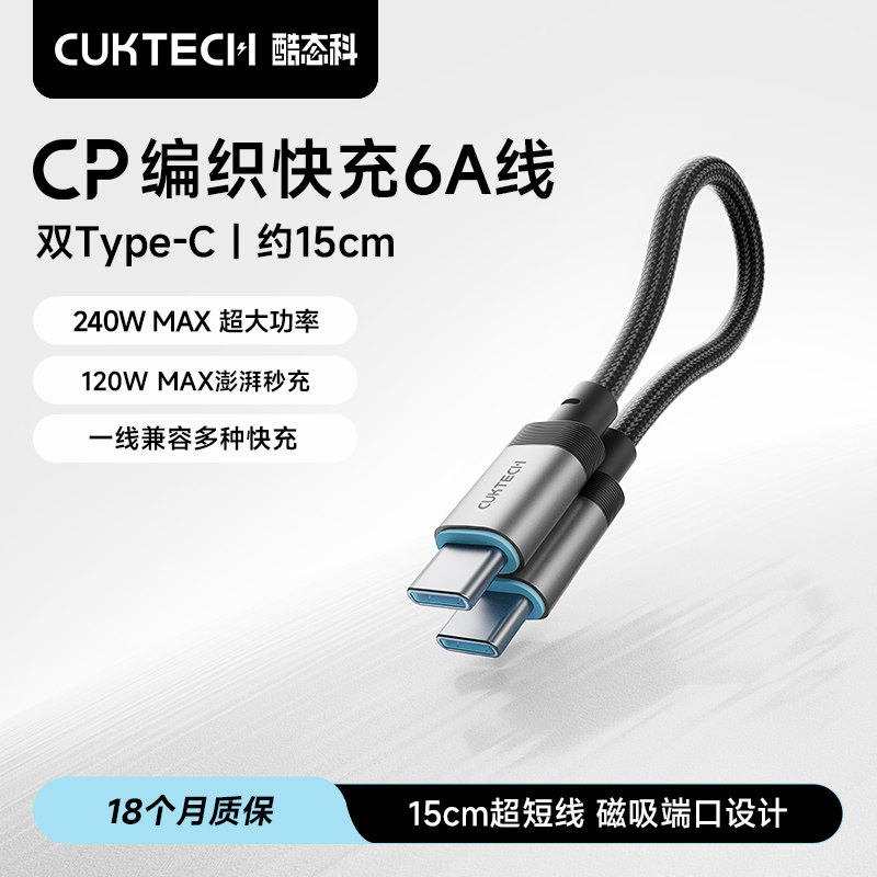 CUKTECH酷态科CP编织快充6A数据线C-C短线240W充电线PD3.1适用于三星小米华为苹果iPhone17Pro安卓Air手机