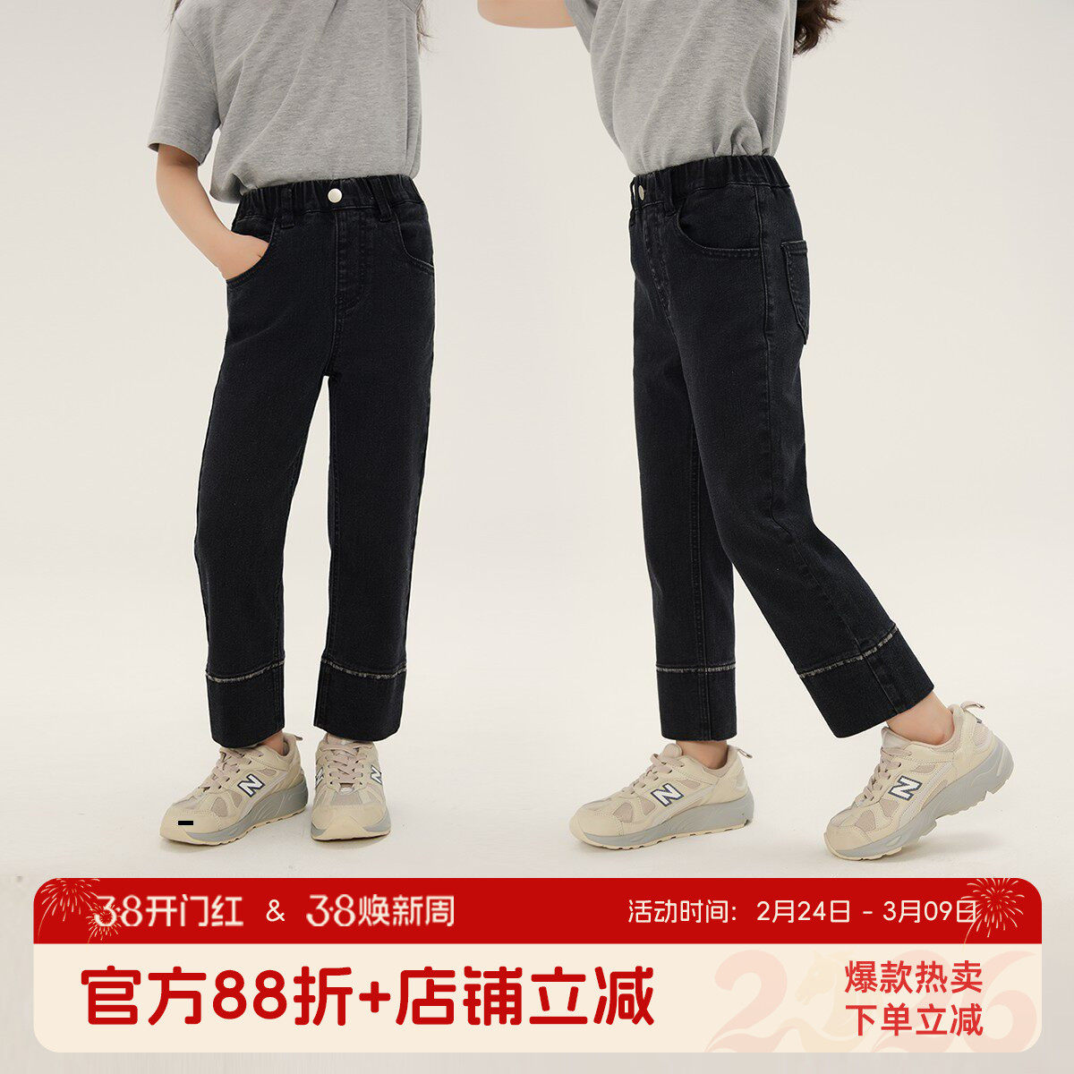 布丁哈鲁春装女童2026春秋季新款儿童洋气直筒弹力黑色休闲牛仔裤