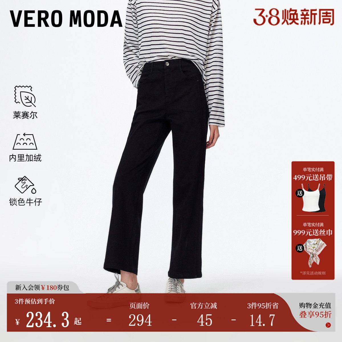 【锁色牛仔】VeroModa牛仔裤女2025冬含棉弹力加绒休闲黑色直筒裤