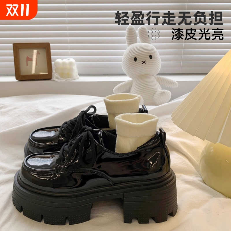 厚底粗跟7CM乐福鞋女2025秋季新款漆皮圆头系带小皮鞋百搭JK单鞋