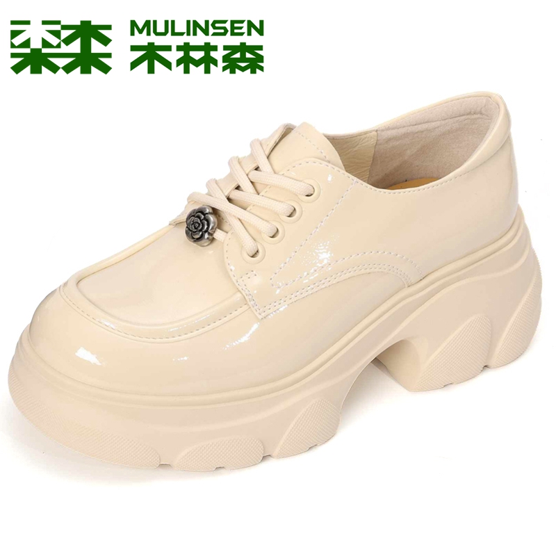 木林森女鞋秋季厚底增高牛漆皮女士单鞋圆头系带粗跟英伦风小皮鞋