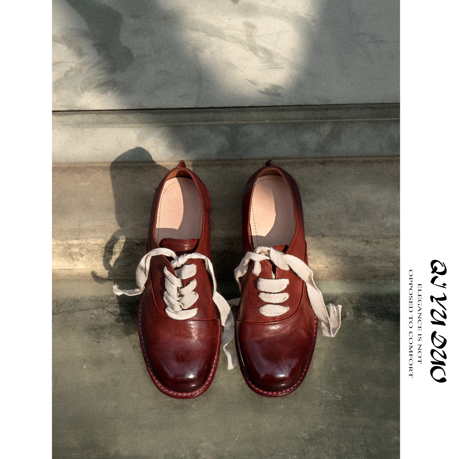 QIYUDUO 复古擦色德比鞋女酒红色真皮粗跟小皮鞋系带圆头通勤单鞋