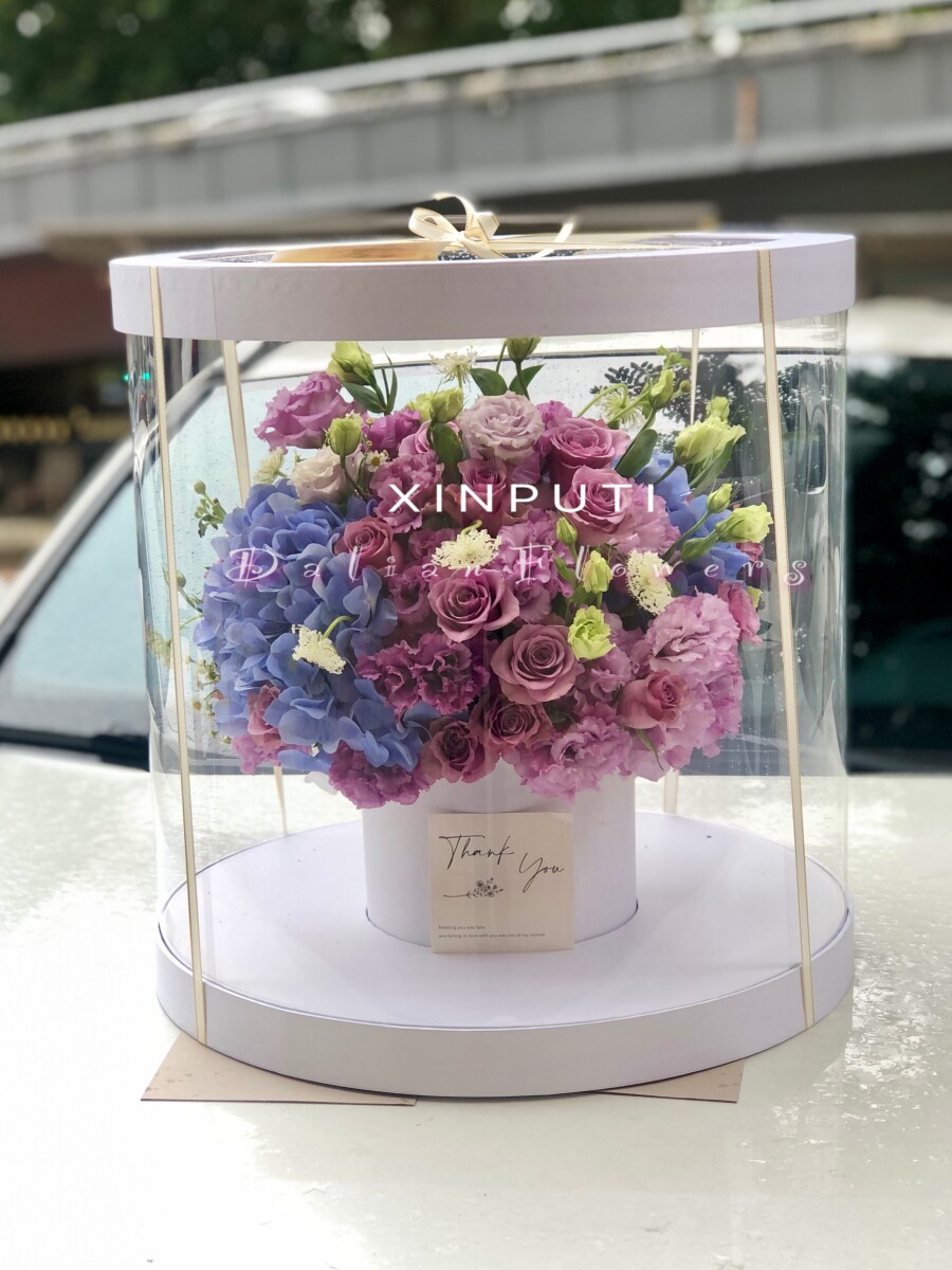 大连鲜花同城速递亚克力抱抱桶紫玫瑰绣球混搭送朋友生日生日祝福