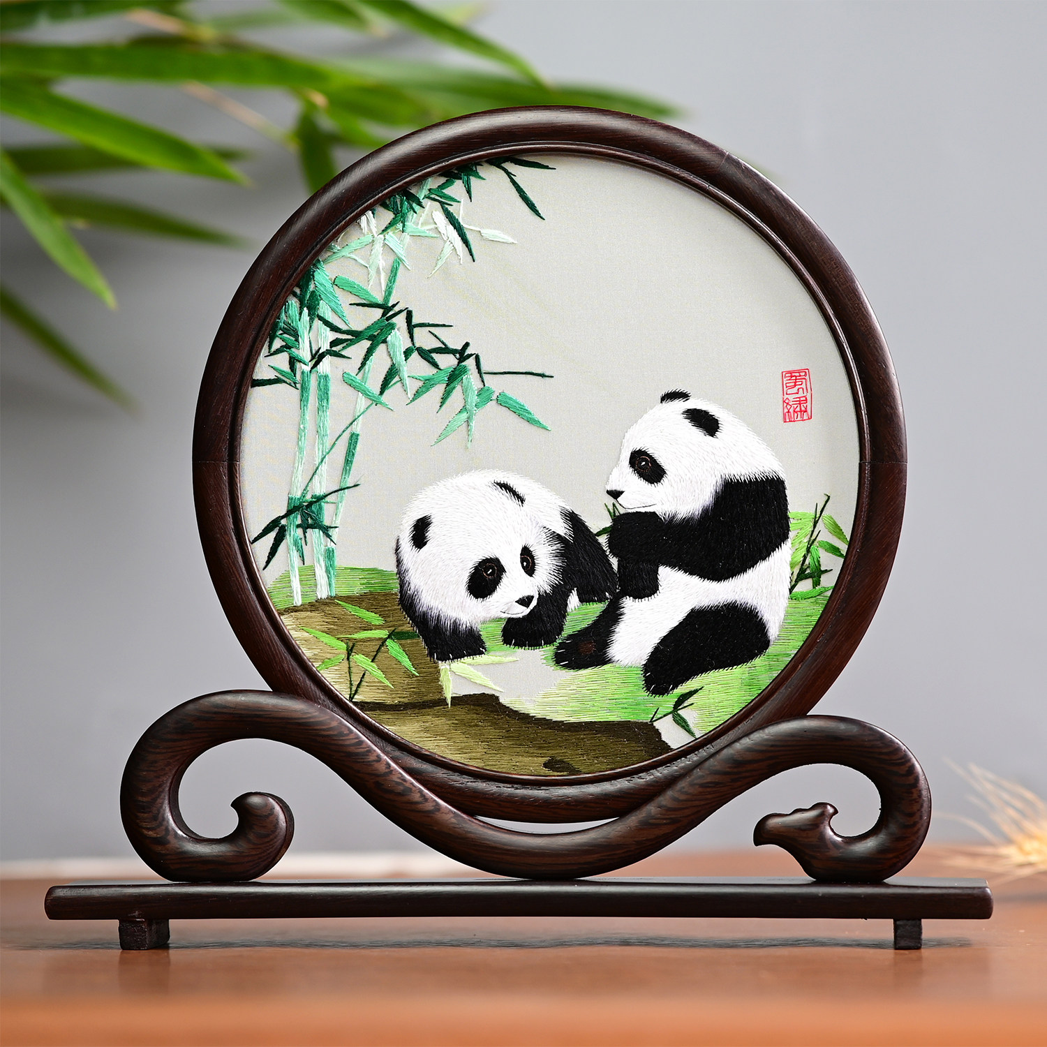 蜀绣双面绣大熊猫屏风手工刺绣摆件鸡翅木如意架礼品礼物成都特产