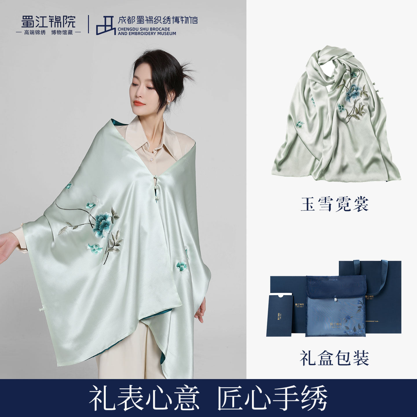 成都蜀绣手工刺绣桑蚕丝围巾绒花胸针套装礼盒送妈妈婆婆会议礼品