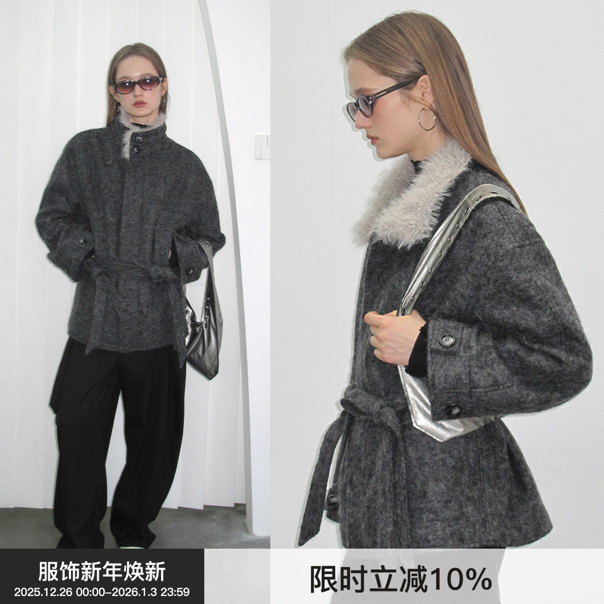 CulturE秋冬小众毛绒廓形宽肩毛呢大衣重磅宽松绑带收腰长款风衣