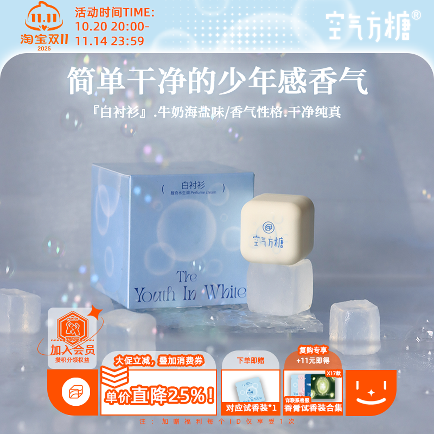 白衬衫空气方糖固体香水学生女士香膏鼠尾草海盐牛奶淡香持久礼物