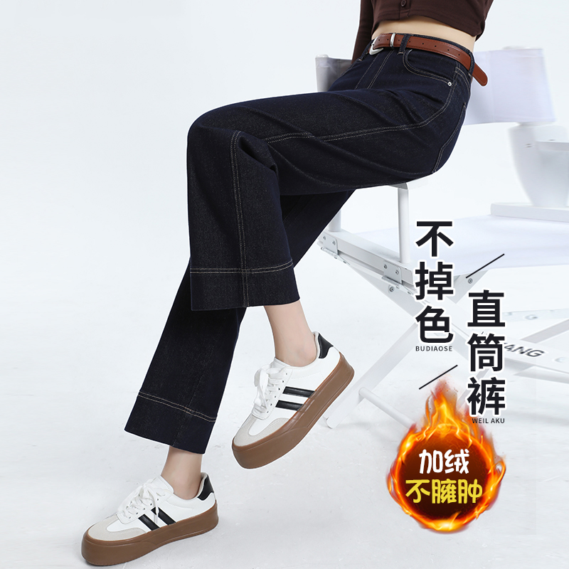 加绒直筒牛仔裤女秋冬新款高腰宽松显瘦小个子八九分毛边阔腿裤子