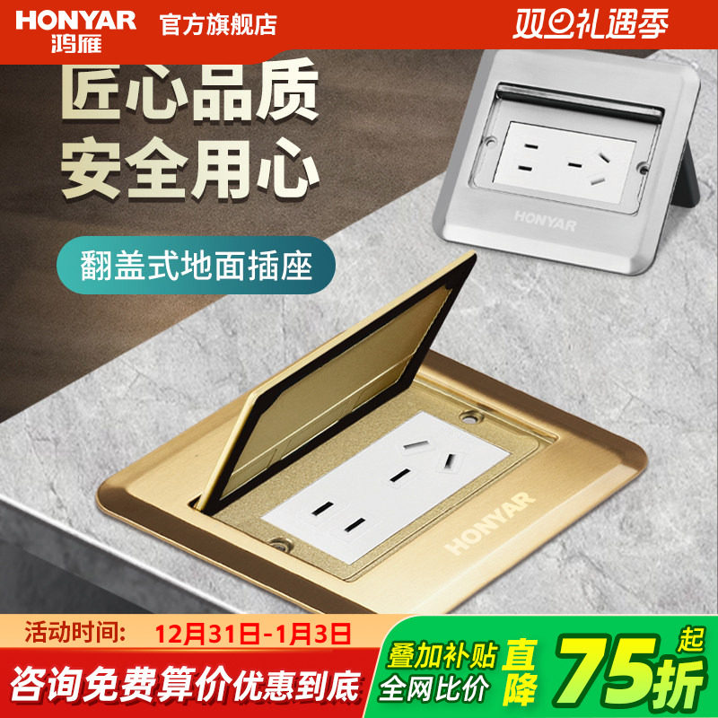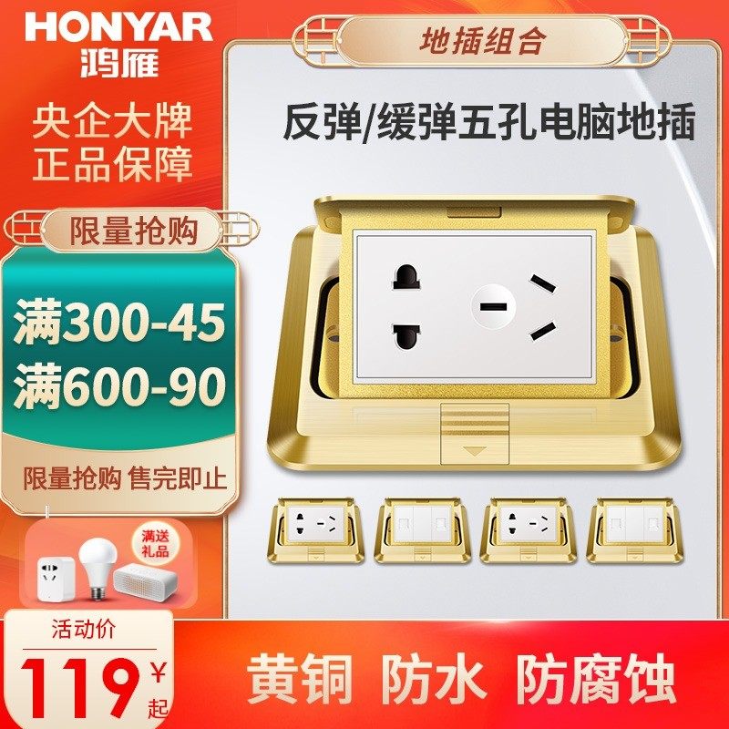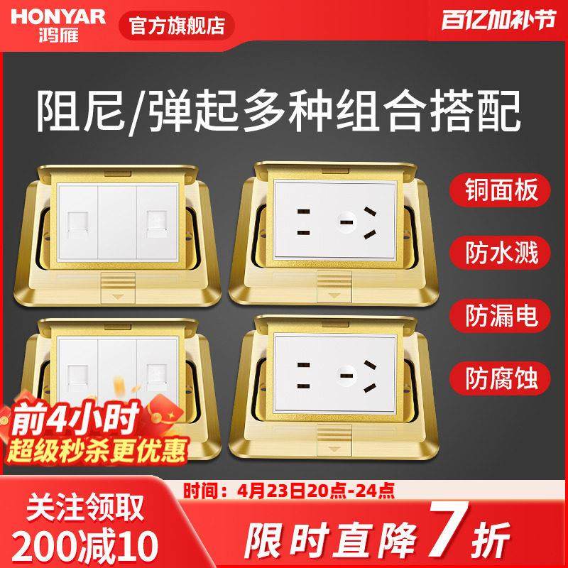 鸿雁地插座全铜防水阻尼五孔地插隐藏式缓弹全铜地板插座防水家用
