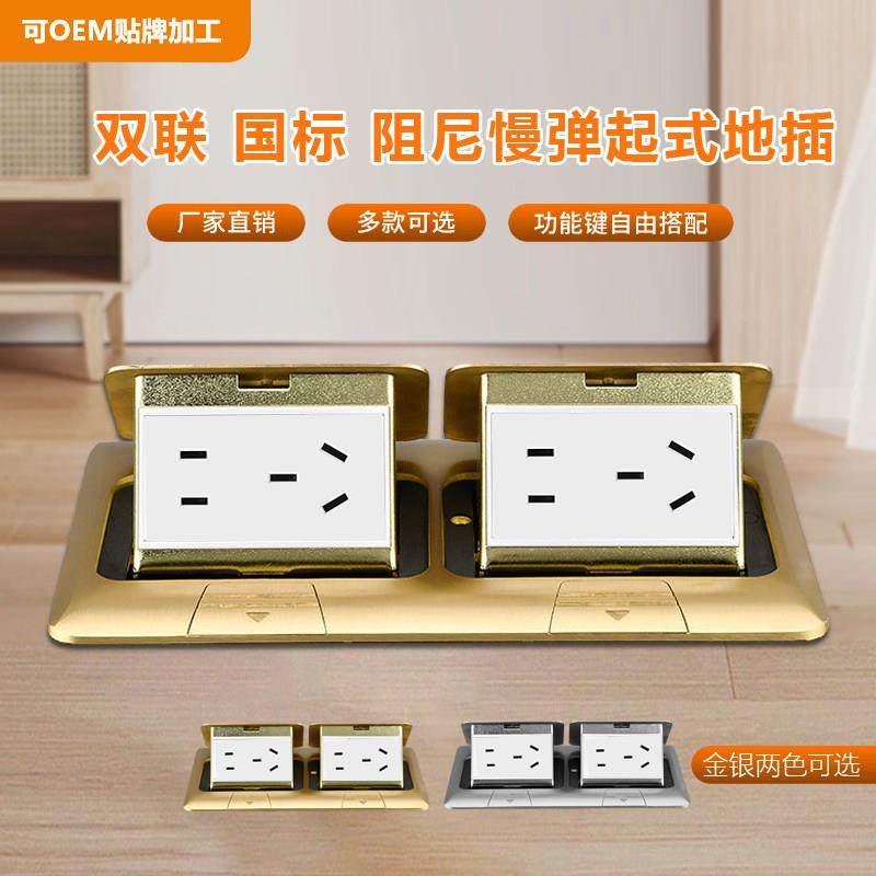 220型双联慢弹起式阻尼全铜地插座五孔网络6类隐藏式防水地板插座