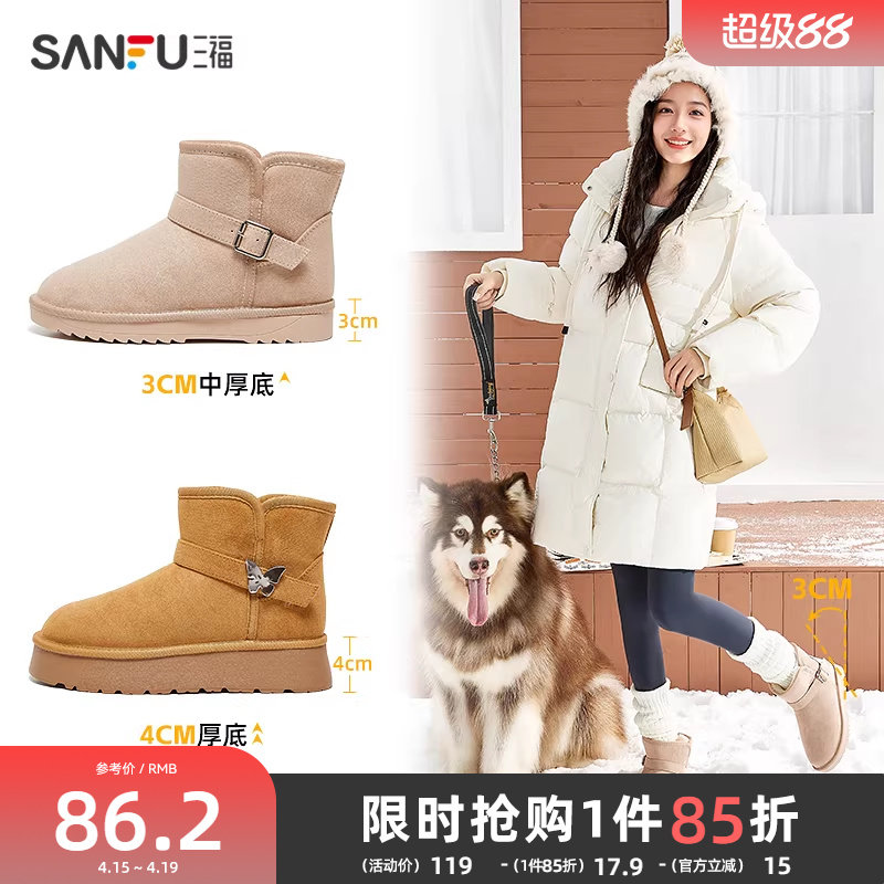三福雪地靴女冬季新款防水防滑厚底保暖加绒中筒棉鞋靴子女832749