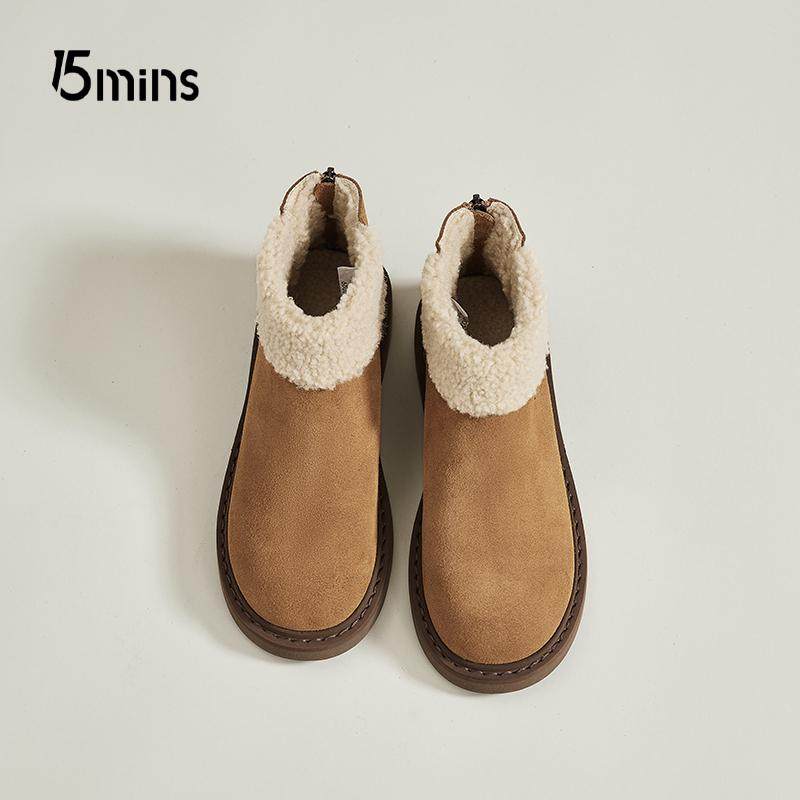 15mins厚底雪地靴女秋冬季2026年新款加绒加厚保暖棉靴粗跟短靴子