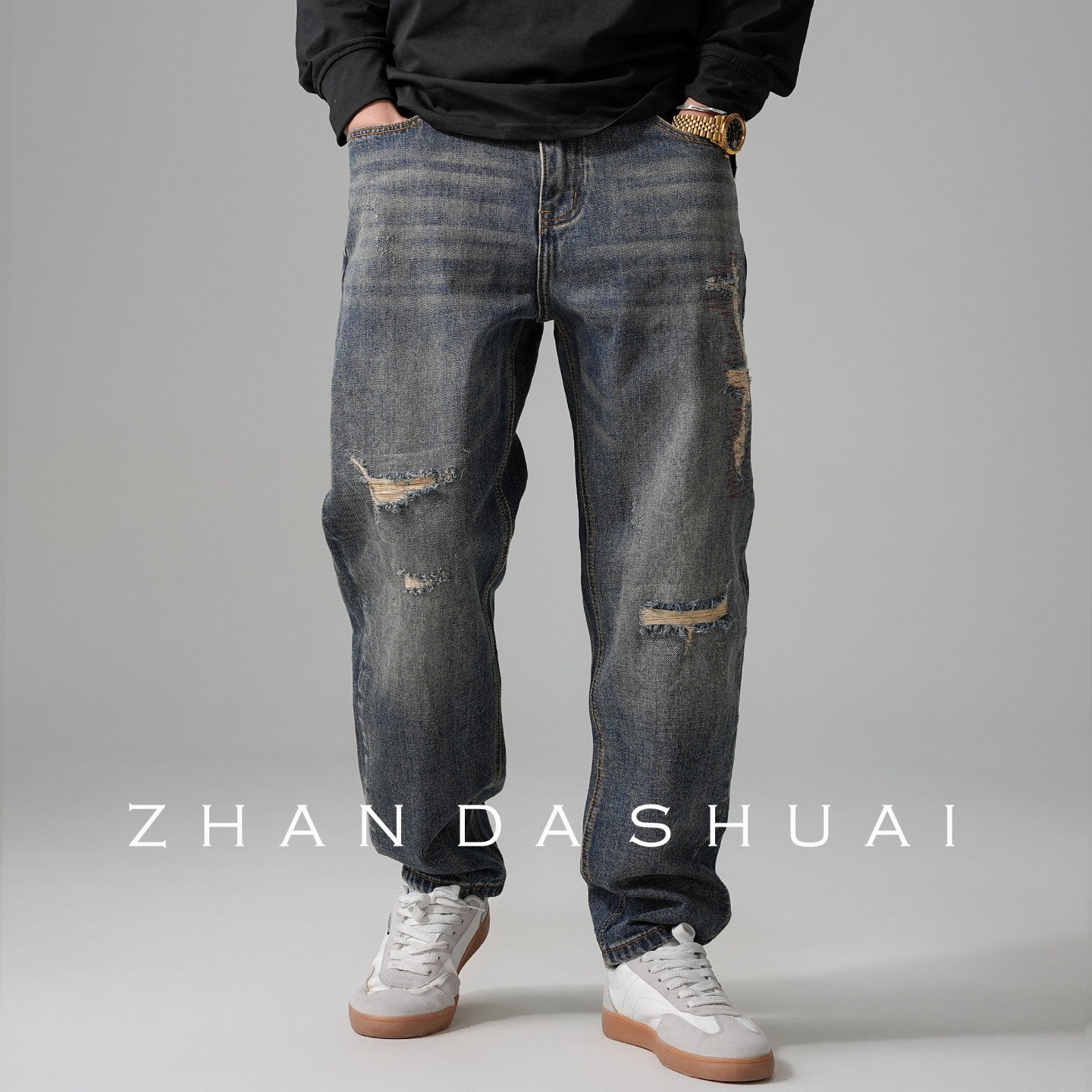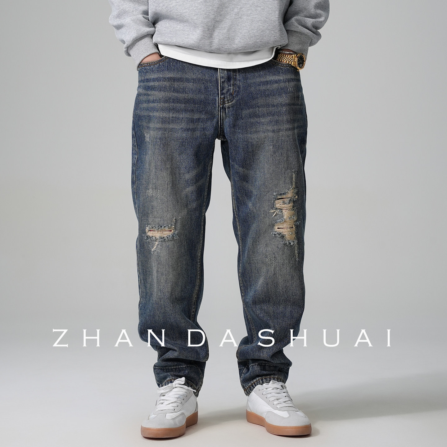 占大帅 美式高端复古做旧破洞牛仔裤男宽松直筒潮牌高街锥形裤子