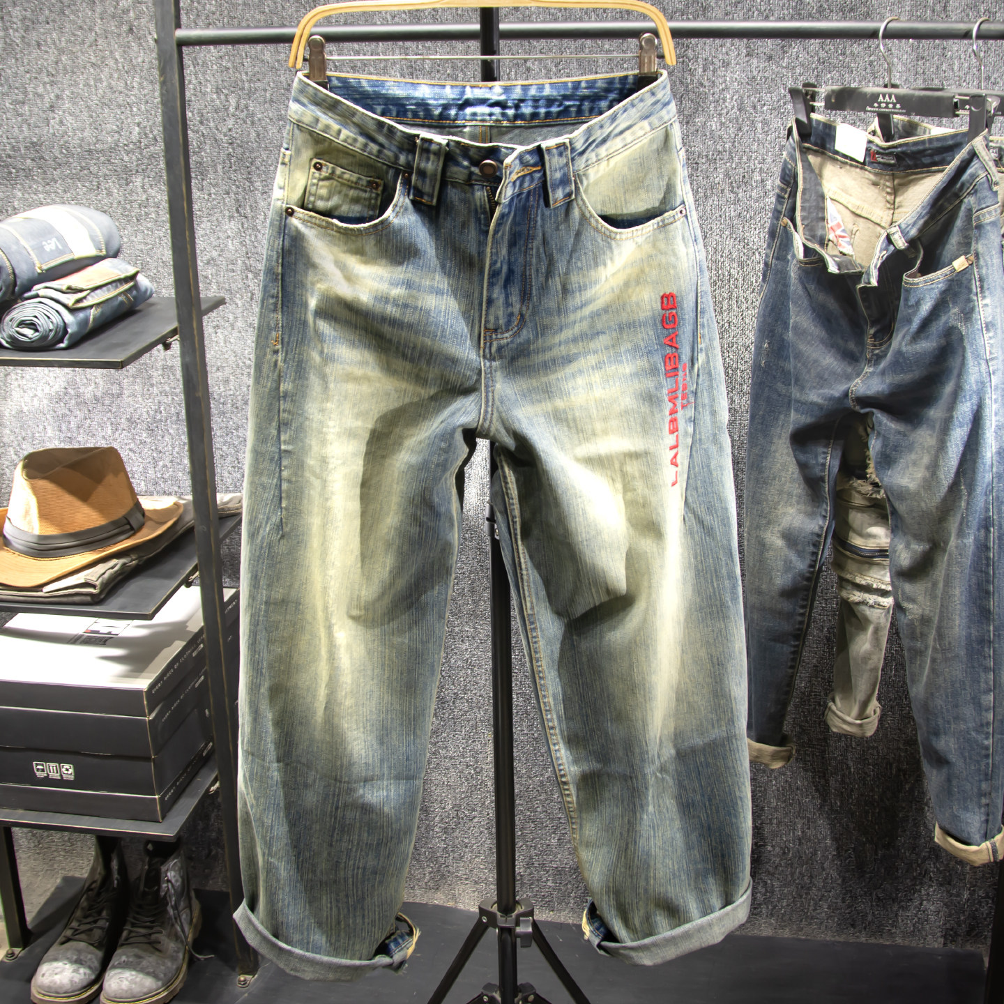 废土做旧脏洗泥染破洞牛仔裤男宽松小众潮牌痞帅美式复古阔腿裤子