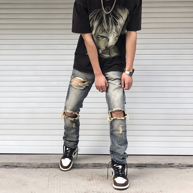 潮流破洞牛仔裤男宽松直筒休闲长裤复古修身裤FOG高街小脚裤怀旧