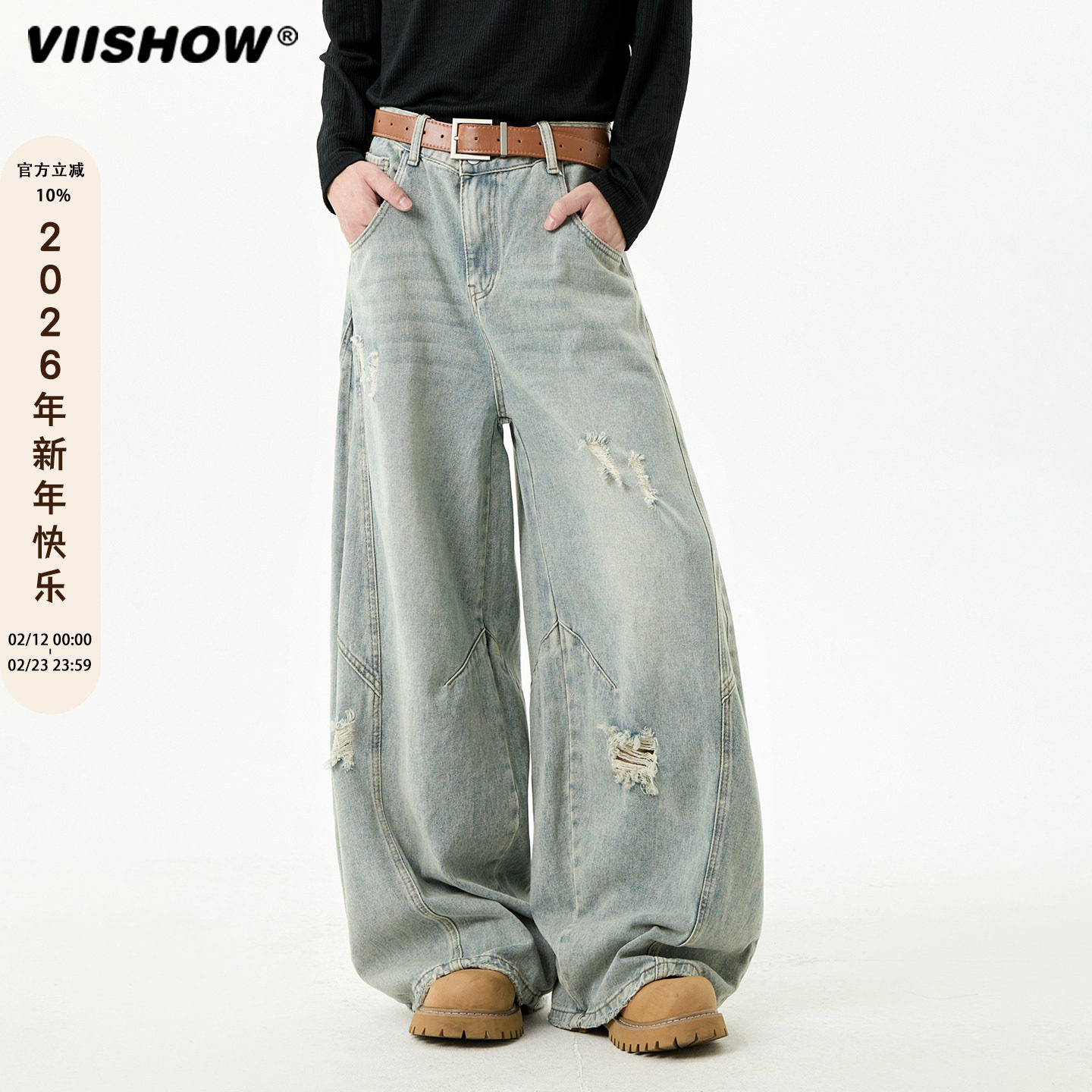 VIISHOW2026春季新款设计弯刀破洞牛仔裤男宽松水洗做旧拖地长裤
