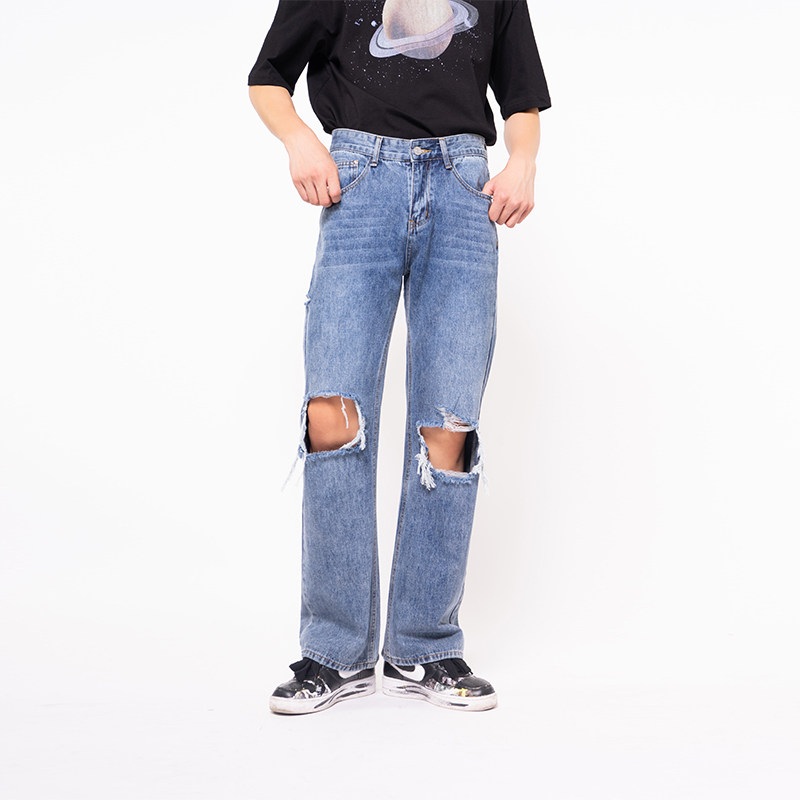 XMOB 夏季薄款破洞牛仔裤男宽松直筒潮流百搭垂感阔腿长裤 男女