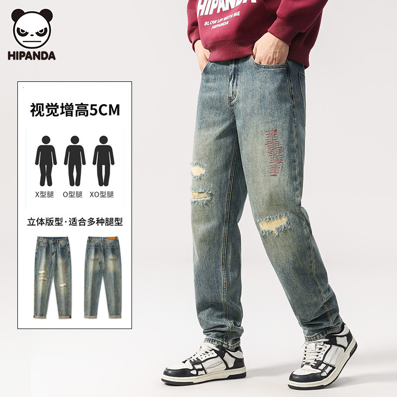 Hi Panda复古高街破洞牛仔裤男宽松直筒裤子秋季新款美式休闲长裤