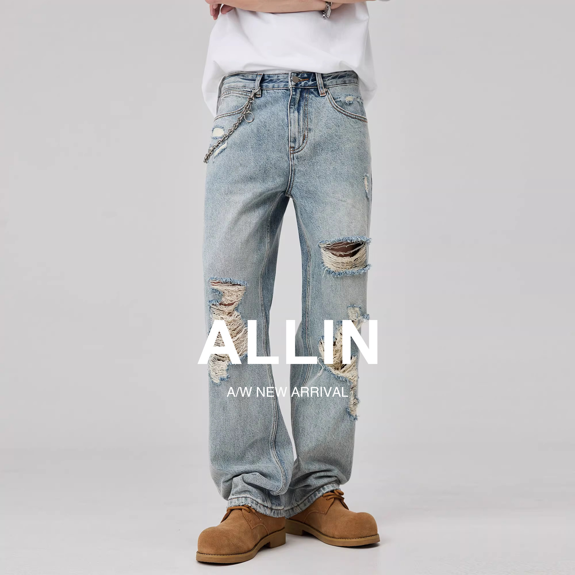 ALLIN 秋冬破洞牛仔裤男宽松直筒阔腿裤子男款浅蓝色水洗微喇长裤