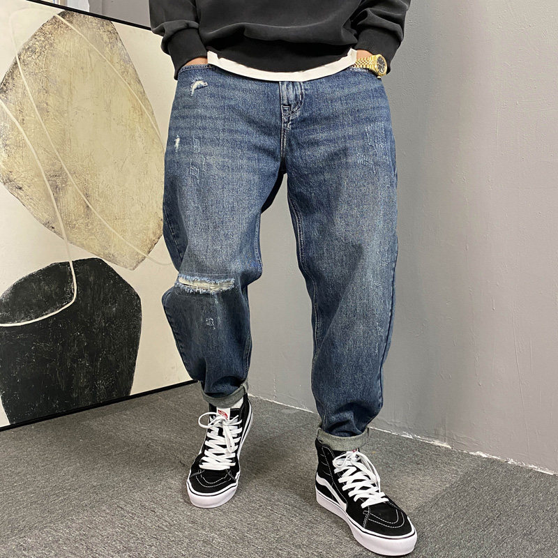 2025秋季破洞牛仔裤男宽松潮牌大码锥形裤男生水洗休闲哈伦裤春秋