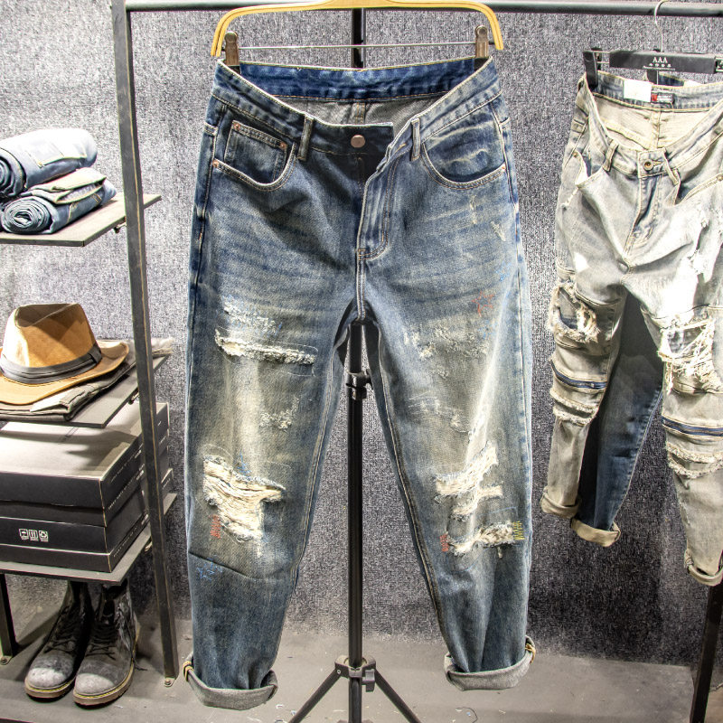 秋季破洞牛仔裤男宽松潮牌直筒九分裤大码潮流刮烂9分哈伦裤子潮
