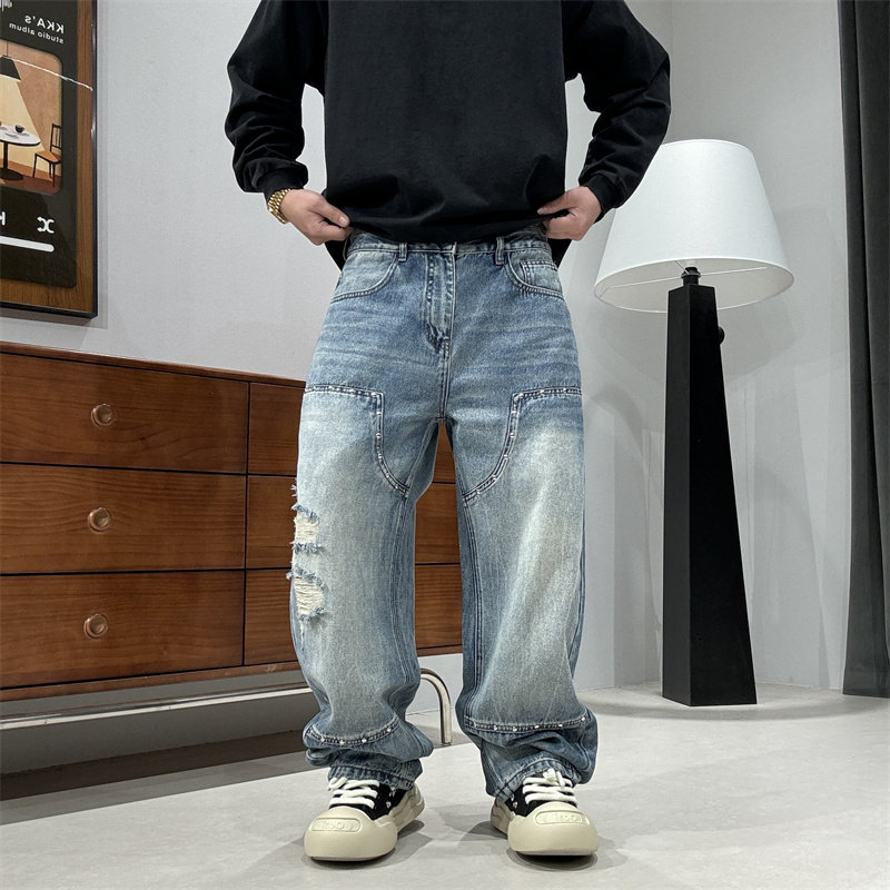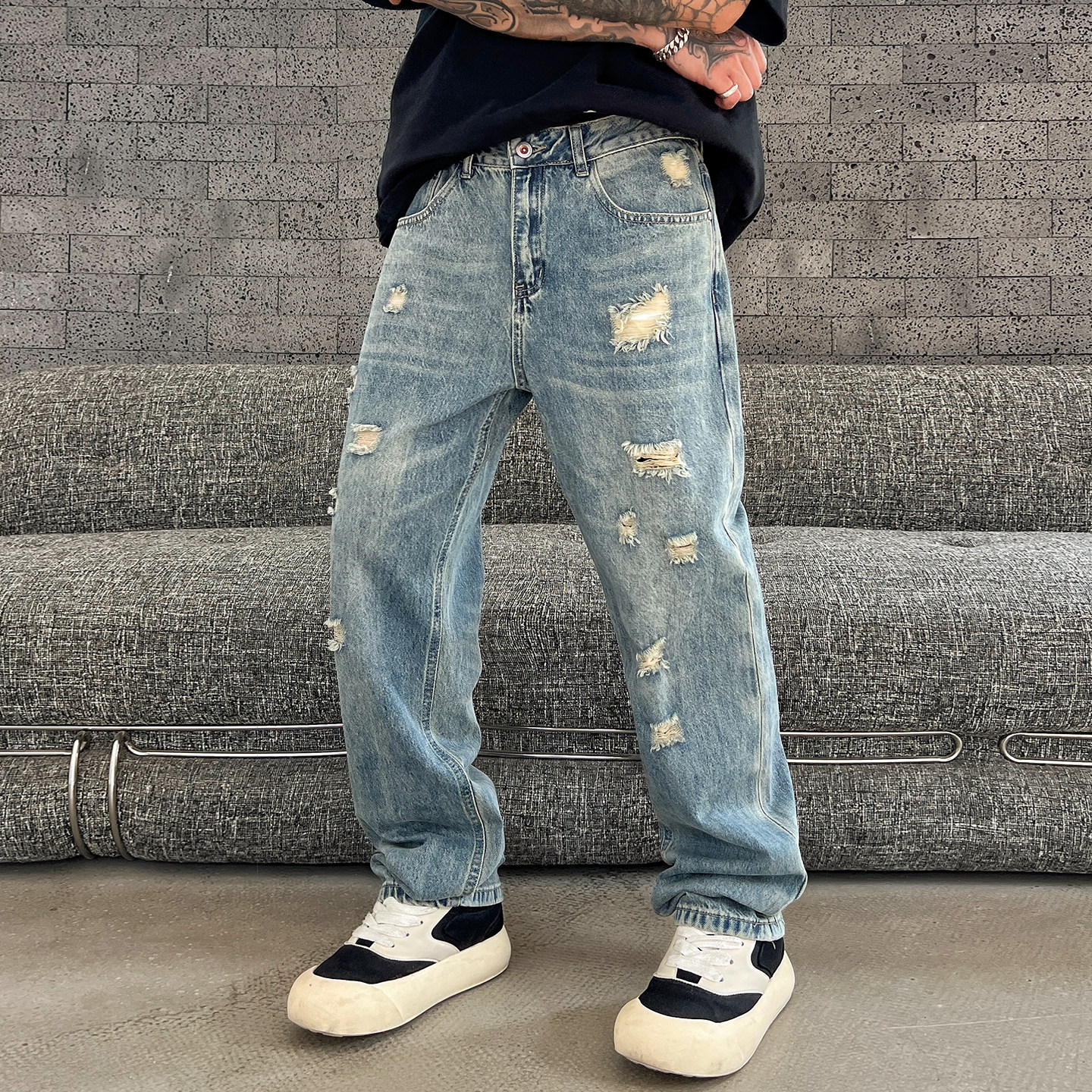 春季美式重磅水洗复古破洞牛仔裤男宽松直筒高街潮流做旧锥形裤子